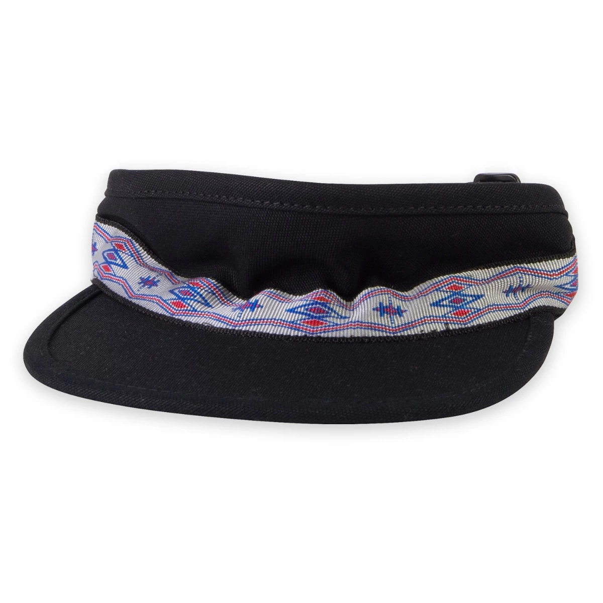 Low-profile visor, slight curved bill, black underbill, patterned nylon tubular webbing with KAVU adjustment.